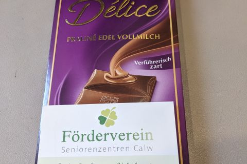 Liebe Freunde und Interessierte des Fördervereins, der Förderverein Seniorenzentren Calw wünscht Ihnen frohe Weihnachtsfeiertage und einen guten Übergang in das neue Jahr. Bleiben Sie gesund. Wir freuen uns auf weitere Begegnungen mit Ihnen. Liebe Grüße Gabriele Vogel und der gesamte Vorstand PS: Die abgebildete Weihnachtsschokolade wurde an alle 220 Bewohner in unseren drei Seniorenzentren zu Weihnachten verteilt.